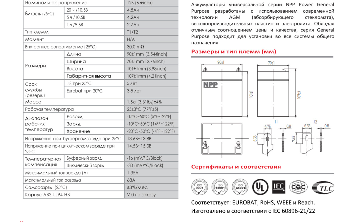 NP 4.5 A/h, 12 V: технические характеристики аккумуляторной батареи