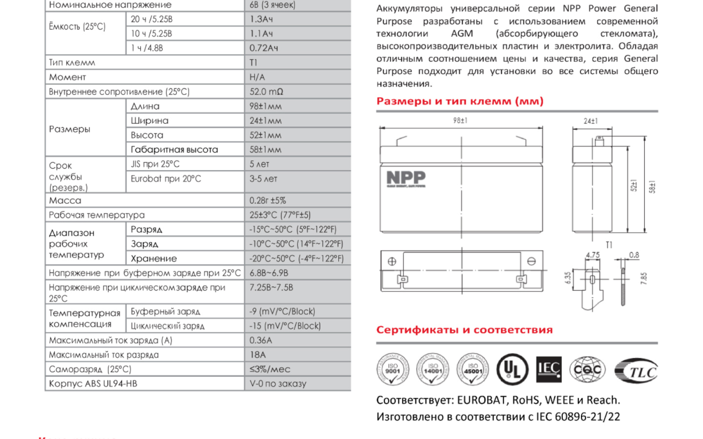 NP 1.3 A/h, 6 V: технические характеристики аккумуляторной батареи