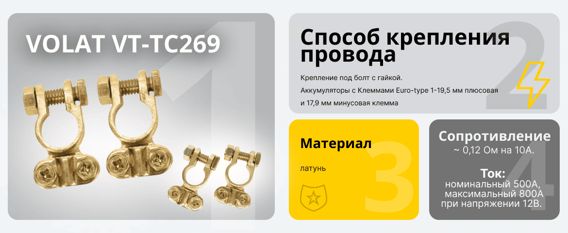 Клеммы VOLAT VT-TС269 — прекрасный выбор для тех, кто ценит надежность и оптимальную производительность при подключении аккумуляторов.