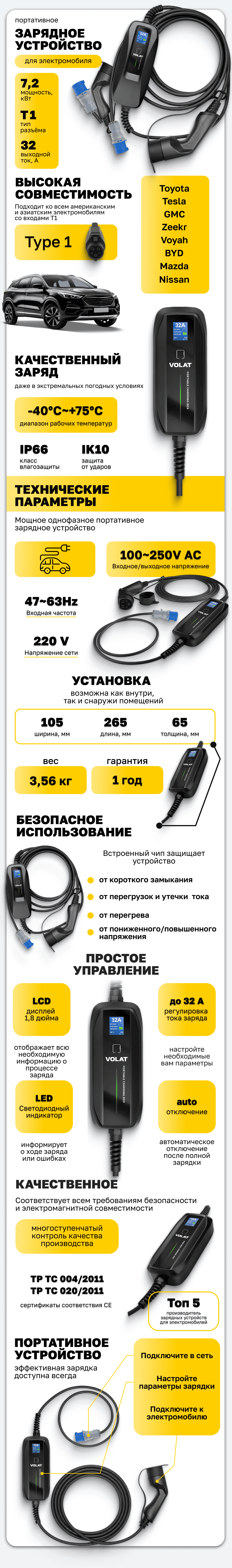 Портативное зарядное устройство для электромобилей VOLAT BS-PCD040 Type1 — это мощное однофазное портативное зарядное устройство, оснащенное ЖК-дисплеем. Оно позволяет заряжать электрические, гибридные автомобили не только на офисных паркингах и возле Вашего дома, но и в путешествии может стать незаменимым помощником. Зарядное устройство подключается к стандартной силовой розетке 32А. Благодаря степени защиты IP66 его можно использовать при любых атмосферных воздействиях.